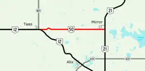 Alberta Provincial Highway No. 50 is a 14.5 km (9.0 mi) east–west highway in central Alberta, Canada. It runs between the hamlets of Tees and Mirror, northeast of Red Deer.[1][2]