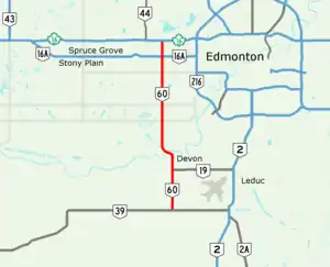 Alberta Provincial Highway No. 60, commonly referred to as Highway 60 and officially named Devonian Way, is a northsouth highway west of Edmonton in the Canadian province of Alberta, connecting Highway 39 to Highway 16. In tandem with Highway 19, it is often used as a southwest bypass of Edmonton for travellers wishing to avoid traffic within the city.[1][2]