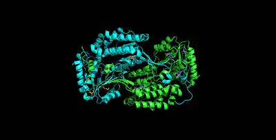 ALDH3A1 is a homodimer consisting of alpha helices (43.8%), beta sheets (4.2%), p-loop turns (28.2%) and random coils (23.8%).[9] The catalytic residue–Cys244—is located on an active site that contains a Rossmann fold that binds the enzyme's cofactor, NAD(P)+.[10]