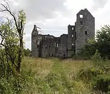In June 1594, a kinsman, David Forrester of Logie, a Baillie of Stirling, was ambushed near Linlithgow during a feud amongst local families. His cause was taken up the powerful Earl of Mar who organised a funeral procession through the lands of the Livingstone and Bruce families, with a painted banner of the victim's body carried between two spears. Forrester was involved in various bands intended to keep the peace.[7] A similar painted banner was produced for the funeral of James Stewart, 2nd Earl of Moray in 1592 and survives at Darnaway Castle.