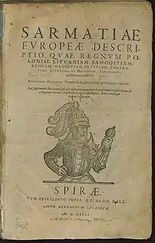 Gwagnin is best known for his Latin work Sarmatiae Europeae descriptio, usually translated as Description of Sarmatian Europe, published in Kraków, 1578, which contained descriptions of the countries of Eastern Europe (history, geography, religion, traditions of Poland, Lithuania, Samogitia, Ruthenia, Masovia, Prussia, Pomerania).[4]