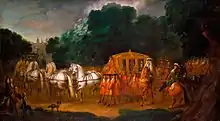 Alexander van Gaelen (1670–1728), who was born at Amsterdam, was the scholar of Jan van Huchtenburgh, and, like his master, painted battles and subjects of the chase, which he treated with great fire and spirit. Whilst he was a pupil of Huchtenburgh, he had an opportunity of improving his touch by copying the works of Wouwerman, Berchem, and other eminent masters, as his instructor was a dealer in pictures as well as a painter; and he was perhaps more indebted to this circumstance, than to the lessons of Huchtenburgh. He soon found himself able to dispense with further instruction, and, resolving on visiting other countries in search of improvement, went to Germany, where he passed some time at Cologne, in the employment of the Elector. After a few years passed in Germany he returned to Holland, where, not meeting with the encouragement he expected, he did not long remain, but determined to visit England, whither some of his pictures had preceded him. He accordingly came to this country in the reign of Queen Anne, and is said to have painted a picture of Her Majesty in a coach drawn by eight horses, and attended by several of the nobility. He also painted three pictures, representing two of the principal battles between the Royal Army and that of the Commonwealth in the time of Charles I, and the Battle of the Boyne. No mention, however, is made of Van Gaelen in Walpole's Anecdotes. He died in 1728.