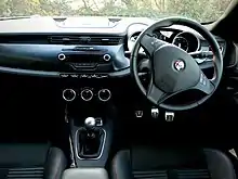 The top of the range model is a version with 1.75 L (1,742 cc) turbocharged TBi engine rated 235 PS (173 kW; 232 hp), lowered ride height (15 mm (0.6 in) at the front and 10 mm (0.4 in) at the rear), 18-inch Spoke design alloy wheels with dark titanium finish and 225/40 R18 tires plus 18-inch 5 hole design alloy wheels as an option; an enhanced braking system (330 mm (13.0 in) front, 278 mm (10.9 in) rear) with calipers painted Alfa red; dark tinted windows, sports kick plates, cloverleaf badges, leather and microfibre seats plus sports leather seats as an option; dark brushed aluminium dashboard.[18][19] 1750 is an engine size which has its roots in Alfa Romeo's history, with 1.75 L engines being used to power some of Alfa Romeo's first cars.[20]