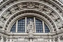 By March 1905 Aston Webb, the architect of the Cromwell Road extension to the Victoria and Albert Museum had commissioned over twenty sculptors to provide statues, carvings and decorations for the facade of the building. Webb allocated what he considered the most prominent areas to Drury and George Frampton.[2] The area over the main entrance arch was assigned to Frampton who created spandrel figures of Truth and Beauty for the space.[13] The area under the arch and the remainder of the main entrance were allocated to Drury. Within the curve of entrance arch he created nine low-relief panels featuring kneeling or crouching female figures holding plaques with gold lettering that when read together form a quotation from Sir Joshua Reynolds.[13] Below the arch, and immediately above the main entrance, is Drury's statue of Albert, Prince Consort and above the arch is his statue of Queen Victoria, carrying a staff and flanked by figures of St George and St Michael.[13] Drury's work was singled out for praise in art press reviews when the overall scheme was completed in 1908. That same year, Webb commissioned Drury to produce a relief panel, of children at play, for the new offices of the Grand Trunk Railway Company in Cockspur Street in central London.[2]