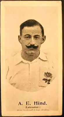 A right arm medium pace bowler and handy lower order batsman, Hind played most of his cricket for Cambridge but also appeared in a first-class match for Nottinghamshire. That match came in the 1901 County Championship, against Leicestershire at Aylestone Road, but in a low scoring encounter but wasn't called on to bowl by his captain Arthur Jones.[3] The previous year he had played a three-day match for Nottinghamshire against the touring West Indians and made what would have been his highest score of 60 except the match wasn't awarded first-class status.[4]