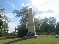 General Alfred Mouton Monument at the Mansfield State Historic Site in Mansfield, Louisiana; the inscription reads: "Here Gen. Mouton fell; here Prince de Polignac sprang to the head of the troops to take the fallen leader's place and bear them to victory." Mouton's grave was later moved to Lafayette, Louisiana.