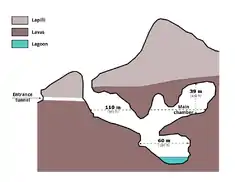 ![]() Profile of the Algar do Carvão with entrance, chamber and lagoon | |