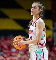 Following her move to Indiana in 2017, Patberg began playing on the Indiana Hoosiers women's basketball team in 2018.[28] From 2019 to 2020, Patberg held the season record in points and assists for Indiana.[29] While with Indiana, Patberg's team reached the Elite Eight at the 2021 NCAA Division I women's basketball tournament.[30] The following year, Patberg was one of the runnerups at the 2022 Big Ten women's basketball tournament with Indiana.[31] During her career, Patberg had 528 assists as part of her 1752 points.[32] Upon leaving Indiana in 2022, she was in the top five for most assists and top ten for most points.[33]