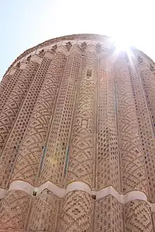 The Aliabad Tower (Persian: برج علیآباد) is a historical tower dating to the 14th century. It is located in Aliabad-e Keshmar, near the town of Bardaskan in the Iranian province of Razavi Khorasan. The tower measures 18 metres (59 ft) in height, with an outer circumference of 42 metres (138 ft) and an internal height of 21 metres (69 ft).[1] The cone-shaped facade is made of brick.[2] The design is reminiscent of the Dakhma of Zoroastrianism. The tower was added to the list of National Monuments of Iran.[3]