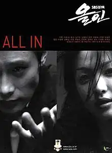 All In (Korean: 올인; RR: Orin; MR: Orin) is a 2003 South Korean television drama series that aired on SBS from 15 January to 3 April 2003, on Wednesdays and Thursdays at 21:55 (KST) for 24 episodes.[1] Inspired by the life of professional poker player Jimmy Cha, it starred Lee Byung-hun and Song Hye-kyo in a story about one's man's rise through the fiercely competitive world of casino gambling as he clashes with his rivals over money, success, and love.[2]