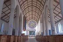 The church's simple layout is of a nave and two flanking aisles, leading to a long aisle-less chancel. However, it starts with a narthex at the base of the tower, containing the baptistery, which is in direct line with the high altar. The simple but noble interior is made bright and airy by vast open spaces, many lancet windows, and plastered walls. The impressive height of the nave (45 ft or 14m) is accentuated by giant drum piers and gothic pointed arches, which hold a coffered wagon roof.[19] The airy, refined interior and coffered roof are later reflected in Dykes Bower's church of The Holy Spirit, Southsea, Hampshire, and in his work on the chancel and transepts at St Edmundsbury Cathedral, including the Cathedral's oriel window, which is foreshadowed by the oriel window at All Saints'. Distinctive to All Saints', the chancel is dominated by an east rose window (see below).[19] Sitting within the church's Gothic setting, the furniture is of a Classical style, including four classical pillars that surround the high altar.[21]