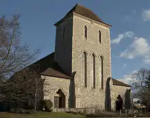 The west front dominates the east side of Bishop's Stortford with its tall, broad central tower and distinctive steep saddleback roof, and three impressively tall lancets.[17] The use of Kentish ragstone facings creates a monumental effect, reinforced by buttresses that flank the aisles and chancel.[18] At the south west entrance there is a 19th-century timber lych gate, which is the only part of the original 1851 church that was not damaged by fire.[19] Indeed, Dykes Bower's brief included the need to use the remains of the old church,[20] a strategy he later employed when rebuilding the destroyed church of St John the Evangelist Church, Newbury.