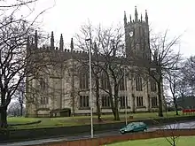 All Saints' Church or Stand Church is an active Anglican parish church in Stand, Whitefield, Greater Manchester, England. It is in the deanery of Radcliffe and Prestwich, the archdeaconry of Bolton, and the diocese of Manchester.[2] The church is recorded in the National Heritage List for England as a designated Grade I-listed building.[3] It was a Commissioners' church, having received a grant towards its construction from the Church Building Commission.[4] The church is a tall building, standing on high ground, and is constructed on a platform.[1]