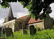 A number of tombs in the graveyard are listed buildings in their own right. The Boghurst tomb is a chest tomb of 1750 close to the south door. The listing draws attention to its inscriptions, the urn balusters and notes that it is railed.[7] The Moulding tomb is another chest tomb, this time of 1789. It lies to the east of the church, adjacent to the old (not current) eastern boundary. The inscriptions and urn balusters are noted in the official description.[8] The Miller monument is a good example of a later (early 19 century) sarcophagus monument notable for the "running dog" frieze.[9]