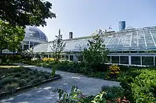 The original domed conservatory was expanded several times during the 1920s, and in 1956 and 1957, with the addition of five new greenhouse.[3][4] In 2004, a sixth greenhouse was opened at the conservatory.[6] In total, the conservatory's six greenhouses cover approximately 1,500 square metres (16,000 sq ft).[1] Two greenhouses are used to house begonia, bromeliads, gesneriads, and orchids.[5] Other greenhouses in the conservatory include a cool temperate greenhouse that houses camellias and plants from Australia and the Mediterranean; a palm greenhouse for a number of palm and tropical vines; the tropical landscape greenhouse for plants like cycads, hibiscus; and the arid house for cacti and succulents.[5]