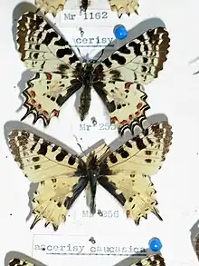 Allancastria caucasica, sometimes referred to as Zerynthia caucasica, is an Old World papilionid butterfly whose geographical range extends from the Black Sea and southern Russia (southern Caucasus Mountains) to Georgia and northeast Turkey. It exhibits several geographical variants. Its natural habitat is temperate forests. It is threatened by habitat loss.