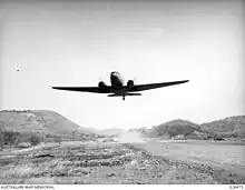 C-53 Dakota transport of the 21st Troop Carrier Squadron takes off from Kila on a supply dropping mission to the Kokoda area.