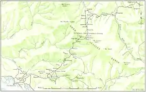 When the campaign began, the Kokoda Track started at McDonald's Corner, just beyond Ilolo. From there, the track slowly rose about 670 metres (2,200 ft) to what later became known as Owers' Corner.[99] The road from Port Moresby was sealed as far as Seven Mile, and from there a gravel surface was laid to provide an all-weather road as far as Sogeri, roughly 51 kilometres (32 mi) from Port Moresby.[100] On 24 June, GHQ queried whether it would be possible to upgrade the track to one that could handle animal transport or, better still, motor vehicles. There were multiple tracks leading to Kokoda, and in addition to the main track, there was interest at New Guinea Force HQ in a route along the Brown River that had been partially surveyed in 1912.[101]