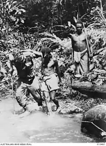 Papuan carriers in Australian service crossing a river between Nauro and Menari in October 1942