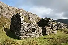 The industrial mines in Allihies date back to 1812 when they were first opened by John Puxley. Mining activity reached its peak there in 1845, when the mines employed around 1600 people, after which the mines suffered with the local area during the Famine.[1] The mines were operational until 1962, when they were finally closed. Large Cornish engine houses were constructed around the mining site, ruins of which survive today. These were used to pump out water to allow for deeper mining, and to transport miners and equipment down shafts that went below sea level.[2] The site still contains a number of engine houses, mining shafts and a church. These were constructed by and for the Cornish miners who were brought to the area in the 1800s to mine copper ore.[3] Once the mine became unprofitable, many of the miners emigrated to Butte, Montana.[4][1]