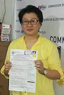 ![]() 2nd District of Samar Board Member Alma Uy-Lampasa during the filing of her Certificate of Candidacy (COC) for 2016 national election in COMELEC | |