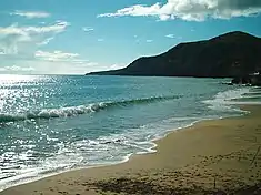 Almagreira is situated in the central southern coast of the island of Santa Maria, limited on the east by the Ribeira do Gato, north-east the regional road dissecting the watersheds of the Ribeira da Praia/Farropo and Ribeira do Salto, north and north-west by the Ribeira de João, Ribeira das Covas and on the west by an escarpment between valley of Valverde and Figueiral.[10] This parish is found within a transitional band from the higher altitude, rugged relief on the eastern coast, and the planar landscape of the western half of the island. The eastern half of the parish is a mountainous zone covered in forests extending to Pico Alto (in the north) and towards Malbusca (in the southeast), passing through Pico das Cavacas (492 metres); it is an area cut by several ravines and substantial watershed on the island.[10] The western portion of the parish extends to its border with Vila do Porto and São Pedro, along a semi-flat plateau broken by a few volcanic cones, such as Pico do Bom Despacho (294 metres) and Pico do Facho (254 metres). This flat plateau area is the broken by walled parcels of agricultural land from Fonte Nova until Touril and Figuerial, and includes large pasturelands in Brejo de Baixo, in an area known as Tremoçal. Tremoçal has been considered for the location of a new Golf Complex, that includes club house, housing and support structures, covering an area of 99.5 hectares of land.[11] Meanwhile, the southern coast fronts a large bay, surrounded by basaltic and sedimentary cliffs (such as Touril or Macela) cut by ravines that disgorge into the ocean. The alluvial drainage from these ravines have, over the centuries, formed white-sand beaches (Praia Grande and Praia Pequeno) in Praia Formosa, which are atypical in the Azores.