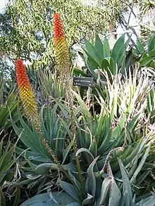 Aloe petricola grows best in early to mid winter, but flowers on this plant typically do not bloom until mid summer, and are seen at their best towards the end of July and beginning of August in the northern hemisphere. Like almost all other aloes, Aloe petricola is drought resistant, meaning that it needs little to no water to survive. This resistance is due to the fact that the leaves of this plant can store water, so they can essentially take care of themselves, making this plant ideal for any gardener.[2][6] Additional growth requirements for this succulent plant include a soil pH that is either acidic, neutral (pH=7), or very slightly basic. It also grows in different soil types, from clay-like soils to sandy soils.[7] This makes maintenance of the plant nearly effortless given the right environment. Aloe petricola is a greatly desired plant for most gardeners because it is considered an undemanding garden plant. Aside from its simple upkeep, this aloe grows quite well in cultivation and looks outstanding either on its own or bunched in groups. The plant's striking and luminous red, yellow, green, and white colors stand out, while they add beauty and elegance to any garden.