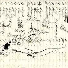Detail of doodles on page image 14 of the Alonzo J. White account book, which lists hundreds of slaves he offered for auction between 1853 and 1863: The doodles include the signatures of Pvt. John Monroe[19] and Capt. John D. Terry[20] of the U.S. Colored Troops, and what appears to be an American eagle; this page was otherwise the third page of a four-page list of "negroes belonging to" Dr. J. W. Schmidt, who had a plantation in St. Bartholomew's Parish, Colleton District, as well as his "city negroes"