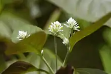 Its vanilla-coloured, pom-pom flowers are ordered in compact clusters (7–20 mm long) in the top leaf branching and are small in shape. These clusters are rounded to slightly lengthened in shape and are foaled on stalks which are normally 3–10 cm long. It can flower any time of the year, but in temperate and cooler subtropical climates it flowers more often in winter.[3] Its very small brown fruit (1.5–2 mm long) contains one seed that's generally hidden within the older flower parts.[4]