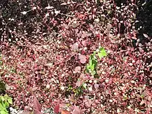 It is an erect, sprawling, herbaceous plant that may grow up to 3 metres tall, though it is usually less than 1 metre as a cultivated plant. The plant's stems, which range between red, green and purple, are delicately hirsute when juvenile, though they'd become glabrescent as they get older. Its opposite leaves, which are 1–10 cm long and 0.7–5 cm wide, are usually coloured purple-specked or luminous reddish-purple.[2] It may lose some of its leaves in winter, making it partially "deciduous" in places that have slightly cool winters.