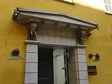 The facade was most likely designed by Jørgen Henrich Rawert. The seven-bay facade features a three-bay median risalit and two single-bay lateral risalits. The three risalits are finished with shadow joints on the ground floor. The median risalit is decorated with giant order Ionic pilasters on the upper storeys, blind balustradess under the windows on the first storey, and a meander frieze. It was originally tipped by a triangular pediment. It was replaced by the current three-bay wall dormer in 1857. The windows of the lateral risalits are topped by hood moulds on the first storey. A brown gate topped by a fanlight is located in the southern corner risalit. The cellar entrance and ground storey window in the northern corner risalit is placed in a shallow, arched niche to create an impression of symmetry.[18]