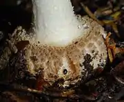 The gills are crowded closely together, free from attachment to the stem, 6–10 mm (1⁄4–3⁄8 in) wide, and white. The lamellulae (short gills that do not extend fully from the cap edge to the stem) have truncated ends. The stem is 37–90 mm (1+1⁄2–3+1⁄2 in) tall, 6–26 mm (1⁄4–1 in) in diameter, and narrowest at center. It is hollow, and has an abruptly bulbous base that is between 14 and 38 mm (1⁄2 and 1+1⁄2 in) in diameter. The surface of the stem above the level of the ring is white and covered in woolly tufts of mycelia; below the ring it is white with buff to greyish transverse, grooved bands. The base may or may not have a rim of volval remnants that are powdery, and a greyish-buff to greyish-sepia colour. The ring is membranous, white to buff, first hanging freely then later adhering to the stem. The flesh of the cap is white, occasionally pale isabelline under the center of the cap; the flesh of the stem is white.[1]