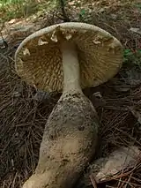 The stem is 10–25 cm (4–10 in) long and 1–3 cm (1⁄2–1 in) wide, and decreases slightly in thickness near the apex. It is solid (i.e., not hollow), white to pale yellow, and covered with tufts of soft woolly hairs or fibrils. It has a large basal bulb, swollen in the middle, which roots in the ground up to 5.5 cm (2 in). The partial veil is yellowish-white to pale yellow, forming a ring which is thick, woolly, delicate, and soon falls away. The universal veil remains at the stem base as thick scales, curved downward, often forming irregular rings.
