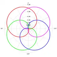 Being omnidirectional, the channel always gets the same constant input signal, regardless of the angles. So that it has more-or-less the same average energy as the other channels, W is attenuated by about 3 dB (precisely, divided by the square root of two).[2] The terms for actually produce the polar patterns of figure-of-eight microphones (see illustration on the right, second row). We take their value at and , and multiply the result with the input signal. The result is that the input ends up in all components exactly as loud as the corresponding microphone would have picked it up.