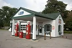 The one-story building has no basement and originally consisted of only the house and canopy portion, and three Texaco gas pumps. The house, or main office portion of the station includes the interior office and the men's and women's restrooms. The men's restroom is accessed from the interior office and the women's restroom is accessed via an outside door on the south side of the building. The original "LADIES" sign still protrudes from the wall above the entrance. The entire house section of the station is 23 feet (7.0 m) by 14 feet (4.3 m).[3] The exterior of the building is wood and sided with clapboard, save the garage bay area which is concrete block. The bay was built during World War II, between 1941–45, and material shortages forced the use of the differing building material.[3]