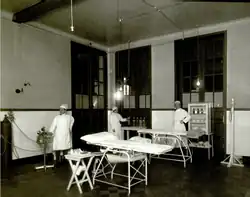 Among some units were the doctors and staff of Base Hospital No. 57.[2] The members of the hospital were organized on April 2, 1918. Most of the men were drafted from Oil City, Pennsylvania.[3] After training they shipped to Camp Merritt, New Jersey where they embarked on the Madingo on July 31, 1918. After stopping briefly in England they boarded the Londonderry and landed in France on August 21, 1918. They moved around France until on September 16, 1918 it was ordered to Paris where they took over 1,800 beds in a large school building in Paris.[2] During the offensives of 1918, the hospital had as many as 2,000 patients.[4] From taking over the Paris school in September 1918 to when the unit left France on August 13, 1919, the hospital unit treated 8,505 surgical and medical cases, and 7,292 dental cases.[5]