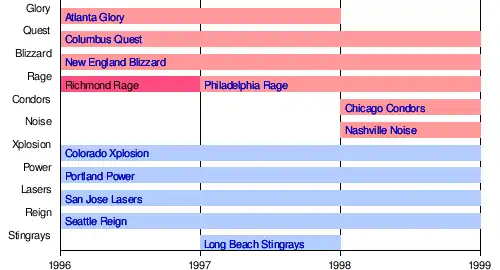 Long Beach StingraysSeattle Reign (basketball)San Jose LasersPortland Power (basketball)Colorado XplosionNashville NoiseChicago CondorsPhiladelphia RageNew England BlizzardColumbus QuestAtlanta Glory