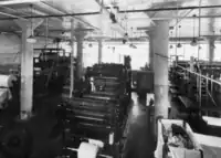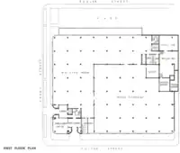 As originally designed, the three-story building included lobbies, a mailing room, book storage, and utilities taking up most of the first floor, while the production departments (paper storage, the press room, and the composing room) took up almost all of the second floor. The third floor held editorial and business offices (private offices for executives and editors, the library, cut-file room, art department, and the circulation department). The private offices had windows onto Front and Fulton Streets, the art department was on the north side of the building, and the other spaces, making up most of the floor area, were lit by large skylights and glass block interior walls.[7][2]