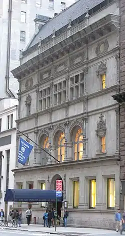 On January 30, 1920, the AFAS building was severely damaged by a fire and the original Vanderbilt Gallery was destroyed. The loss was estimated at $1 million, of which half was the cost of the destroyed art.[58] Despite this, the AFAS was able to repair the building and the rebuilt galleries opened in March 1921.[59] During the following two years, as a result of the widening of 57th Street, the AFAS rebuilt the building's main entrance and the adjoining sidewalk and erected a new underground boiler room. By 1925, the building housed the headquarters of several artistic organizations in addition to the Architectural League, Art Students League, and National Academy of Design.[30] The Architectural League moved to a new clubhouse at 115 East 40th Street in December 1927,[60] although it retained shares in the AFAS.[30] Events held at the AFAS building in the 1920s and 1930s included Metropolitan Museum of Art president Robert W. DeForest's 80th-birthday celebration in 1928,[30] and an exhibition of 351 prints from the Oval Table Society in 1936;[61]