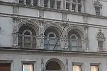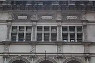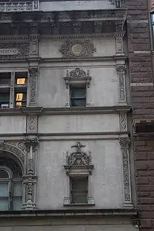 The facade on 57th Street is made of limestone. A small cornice runs above the ground story, while horizontal band courses run above the second and third stories. The main entrance is an ornate archway at the center of the ground story, which is flanked with stone balusters resembling candelabras. Three rectangular windows run along a sill on either side of the main entrance. At the second story, the three center windows are ornately decorated arches flanked by sculpted colonettes, while the two outer windows are small rectangular openings with ornate gables.[2][9] At the third story, the three center windows contain stone mullion and transom bars, while the two outer windows are small rectangular windows with gables.[9] There are three plaques in the band course directly above the center window openings, with the words "Painting", "Architecture", and "Sculpture".[11][12][14] A large cornice and a balustrade run above the third-story band course.[2][9]