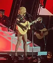 On October 15, 2008, Madonna performed a snippet of "American Life" as the request song during the Boston stop of her Sticky & Sweet Tour.[55] Eight years later, Madonna sang "American Life" on her Madonna: Tears of a Clown show at a benefit gala on December 2, 2016, at Miami Beach's Faena Forum. The concert was held along with an accompanying art auction and dinner, to benefit Madonna's Raising Malawi foundation to support their projects like the Mercy James Pediatric Surgery Hospital in Malawi, as well as art and education initiatives for impoverished children in the country.[56] The Tears of a Clown show was over an hour long, and featured Madonna giving her opinions on the 2016 United States presidential election and attacking President-elect Donald Trump.[57] Before singing the song, Madonna spoke about the turmoils of the Native Americans and the Dakota Access Pipeline protests.[57] On June 30, 2019, Madonna performed an acoustic guitar-driven version of "American Life" as part of her mini concert at the Stonewall 50 – WorldPride NYC 2019, to commemorate the 50th anniversary of the Stonewall riots.[58] She came onstage dressed in a black leather jacket and a sparkling patch over her left eye and was surrounded by dancers dressed as soldiers.[58] Joel Lynch from Billboard opined that "the message of 'American Life' has only grown more timely in the 16 years since its release".[59] A similar performance of the song was done on the singer's Madame X Tour, that same year; Madonna played the guitar while uniforms fell down from above the stage and dancers dressed as soldiers dragged a coffin covered with a flag.[60][61] For Rolling Stone's Rob Sheffield it was one "of the night’s big musical surprises".[62]