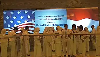 In the first six months of operation, the public affairs officer reported almost 44,000 visitors.[53] The project also maintains a social media presence including Twitter and Facebook.[53] Cameron R. Hume, the U.S. Ambassador to Indonesia at the time, was on hand for the opening.[54] Dino Patti Djalal described the space as "hip, modern and open – a place where young people want to hang out."[52] The use of communications technology, especially the U.S. provision overseas of connectivity to social media, has been described as reflective of a post-9/11 push to spur audience engagement in foreign lands in pursuit of U.S. public diplomacy objectives.[55] The success of @america is credited with the 2011 revamp of American Spaces with a focus on exhibiting American technology and culture, although @america has been criticized for posting high visit numbers without visible public diplomacy achievements.[56]