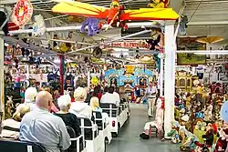 The Toy Box takes up the majority of the space in the American Treasure Tour. Visitors are driven in an electric tram down lanes displayed with an eclectic collection of Americana on both sides and hanging from the ceiling. Tours are conducted by guides who discuss the items, including: model airplanes, classic cars, more automatic musical instruments, original artwork, movie memorabilia and Disneyana, stuffed animals, animated store displays, motorcycles, and neon signage.[18] Highlights include: