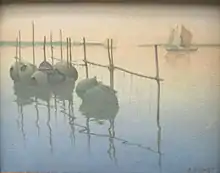 The Marblehead Pottery was founded in Marblehead, Massachusetts in 1904 as a therapeutic program by a doctor, Herbert Hall, and taken over the following year by Arthur Eugene Baggs. The pottery's vessels are notable for simple forms and muted glazes in tones ranging from earth colors to yellow-greens and gray-blues. It closed in 1936.[7][8]