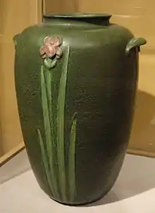 American art pottery (sometimes capitalized) refers to aesthetically distinctive hand-made ceramics in earthenware and stoneware from the period 1870-1950s. Ranging from tall vases to tiles, the work features original designs, simplified shapes, and experimental glazes and painting techniques. Stylistically, most of this work is affiliated with the modernizing Arts and Crafts (1880-1910), Art Nouveau (1890–1910), or Art Deco (1920s) movements, and also European art pottery.