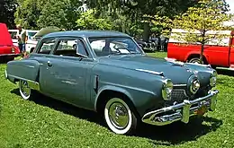 Studebaker had enjoyed earlier success and was the first independent automaker to produce an overhead valve V8 engine,[8] a 232.6 cubic inch, 120 hp unit, the first low-priced V8. The company's peak year was 1950, when it produced and sold 329,884 units.[9] Studebaker struggled during the first half of the decade. The cars had styling ahead of their time but were overpriced when compared to the offerings of the Big Three. Low sales and financial difficulties led to a merger with Packard in 1954, itself in financial trouble.[9] The new company, Studebaker-Packard Corporation, retired the Packard name in July 1958,[10][11] but continued marketing automobiles under the Studebaker name until 1966.[12]