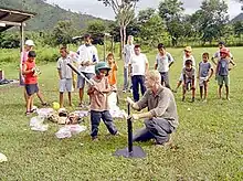 A peace corps volunteer plays Baseball with some honduran children from the villages.