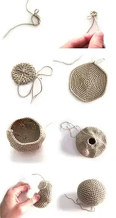 Amigurumi can be knitted, though they are usually crocheted out of yarn or thread, using the basic techniques of crochet (such as single crochet stitch, double crochet, and invisible decrease). Amigurumi can be worked as one piece or, more usually, in sections which are sewed or crocheted together. In crochet, amigurumi are typically worked in spiral rounds to prevent "striping", a typical feature of joining crochet rounds in a project.