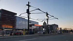 Amsterdam Street is a QLINE streetcar station in Detroit, Michigan. The station opened for service on May 12, 2017,[1] and is located near the southern end of New Center.[2] The station services the northern portion of the campus of Wayne State University and the Ford Piquette Avenue Plant, a museum and former car factory where the first Ford Model Ts were built.