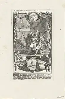 On 19/20 April Gotzkowsky bought a huge amount of grains (oats) through the intermediation of the Russian envoy Vladimir Sergeevich Dolgorukov (1717 - 1803).[5] It was stored in Kolberg and along Pommeranian coast, sitting unused after the Russian army had left the Poland. Both Russia and Prussia were hoping for a swift sale, that would allow for a discharge of the troops who had to guard these supplies. Because of a grain shortage and famine in Prussia, the transaction could have been profitable for Gotzkowsky and De Neufville, the latter one secretly collaborating with two partners Stein and Leveaux, all collectors of art.[6] Neufville paid 100,000 guilders down payment (in exchange bills) on behalf of the buying syndicate. The remaining one million guilders were to be paid by Gotzkowsky in four terms, within a year. Two Russian traders, Svešnikov and Rogovikov, would take over a 1/5 of the total grain sold.[7] The remaining 4/5 was allocated to Gotzkowsky, De Neufville, Leveaux and Stein.[8] The contract was signed by just two men: Gotzkowsky and Svešnikov.[9]